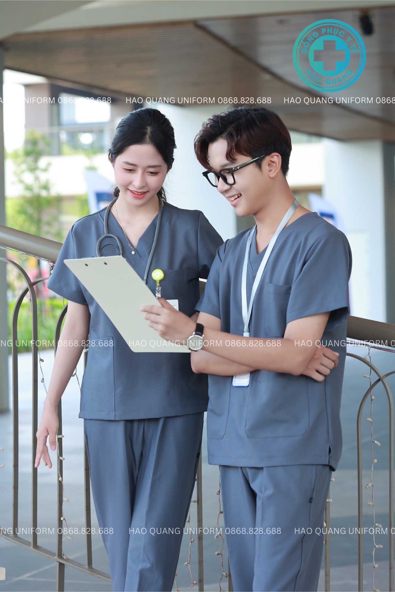 Bộ scrubs cổ tim màu XÁM ĐẬM - Mã 012