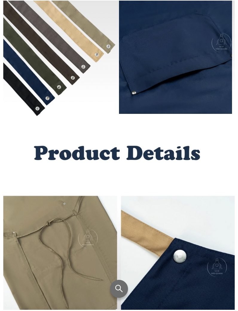 Tạp Dề Hào Quang luôn là lựa chọn hàng đầu để tạo nên tính chuyên nghiệp, xưởng may riêng của chúng tôi có dây chuyền sản xuất gia công và dây chuyền sản xuất nguyên liệu riêng, cũng như thiết bị gia công và in, nhuộm quy mô lớn, chuyên nghiệp, có thể tùy chỉnh mọi kiểu dáng, độ bền tay nghề, màu sắc, kiểu dáng, chất liệu vải có thể được tùy chỉnh. Có thể được tùy chỉnh theo mẫu, có thể được in với logo theo yêu cầu.
